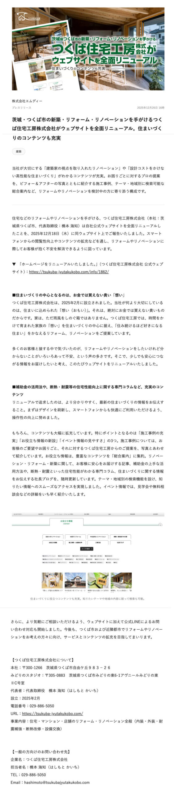 茨城県つくば市のつくば住宅工房株式会社は、2025年12月18日に公式ウェブサイトを全面リニューアル。