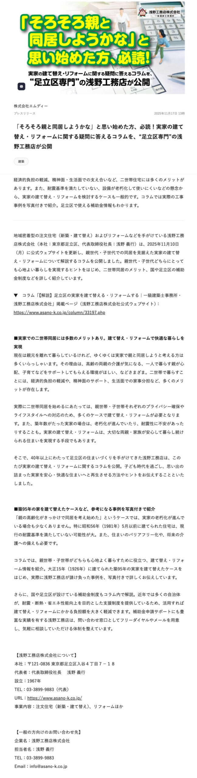 ▼ コラム「【解説】足立区の実家を建て替える・リフォームする|一級建築士事務所・浅野工務店株式会社」掲載ページ(浅野工務店株式会社公式ウェブサイト):