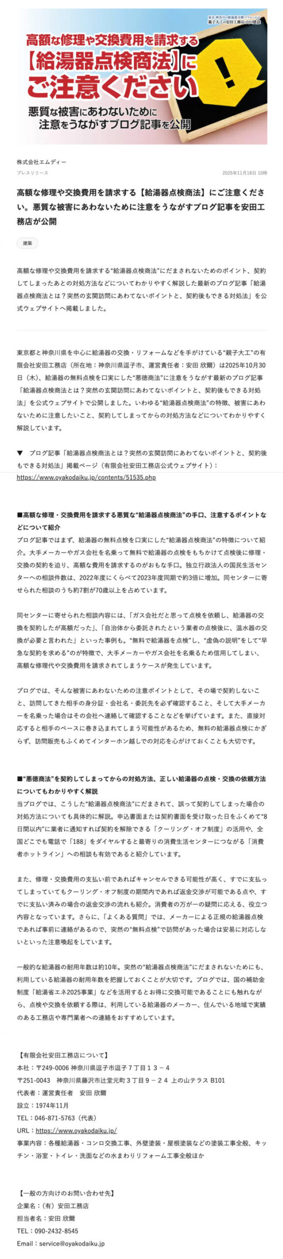 東京都・神奈川県を中心に給湯器交換やリフォームを手がける「親子大工」の有限会社安田工務店は、給湯器の無料点検を装った悪質商法「給湯器点検商法」への注意を呼びかける最新ブログ記事を公式サイトに公開しました。