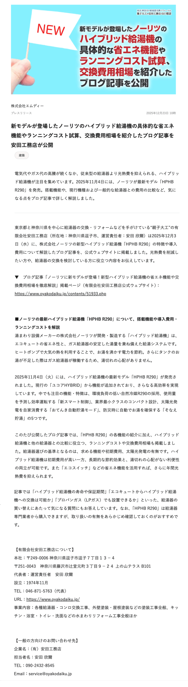 ブログ記事では、機能の特長に加え、他方式給湯器とのランニングコスト比較や交換費用の相場、選び方のポイントを解説しており、給湯器の買い替え検討に役立つ内容となっています。
