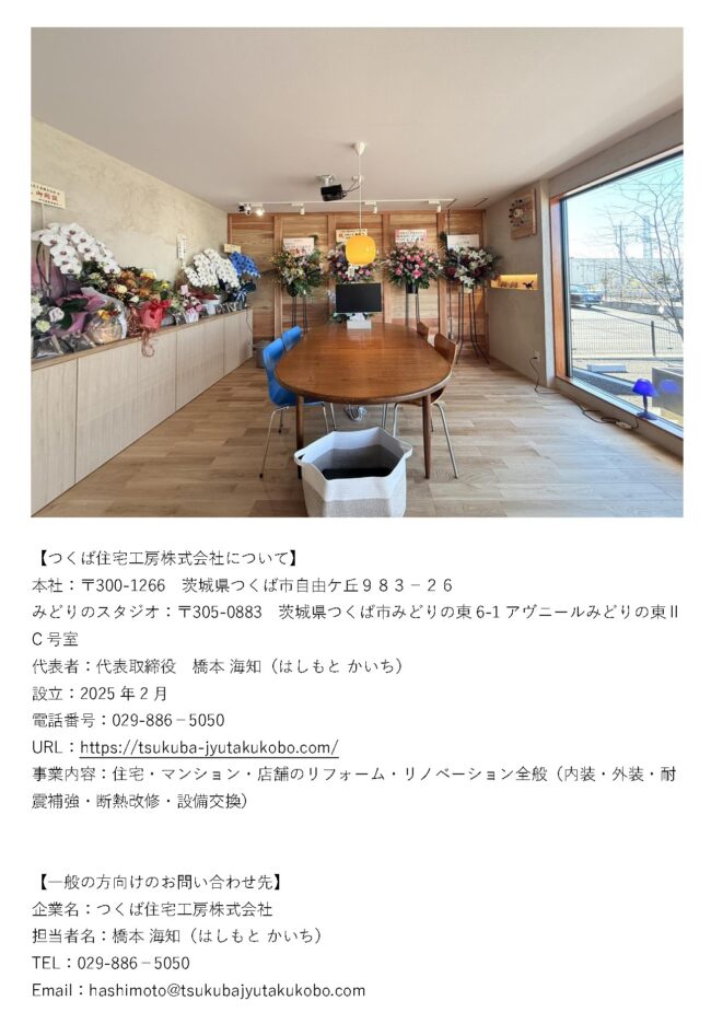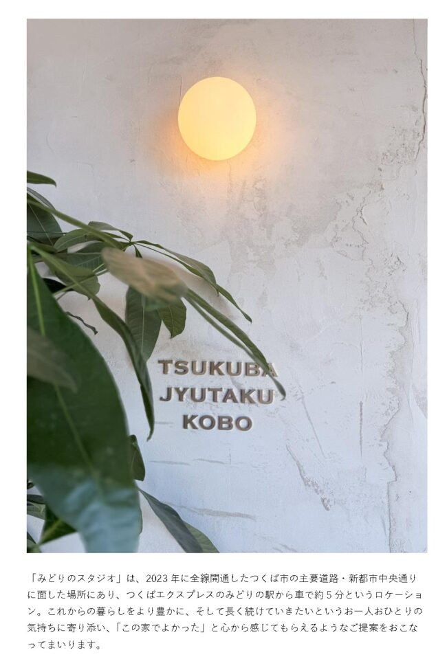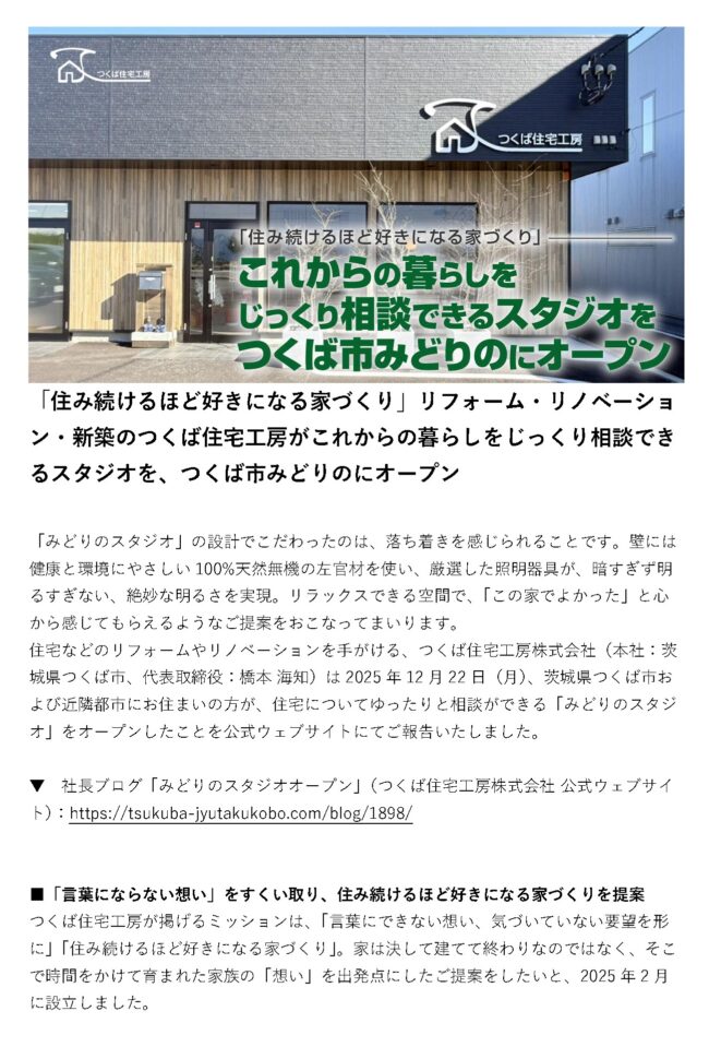 「住み続けるほど好きになる家づくり」を掲げるつくば住宅工房は、2025年12月、つくば市みどりのに住まいをゆっくり相談できる「みどりのスタジオ」をオープンしました。