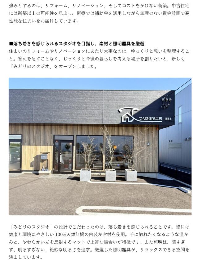 ▼ 社長ブログ「みどりのスタジオオープン」(つくば住宅工房株式会社 公式ウェブサイト):https://tsukuba-jyutakukobo.com/blog/1898/