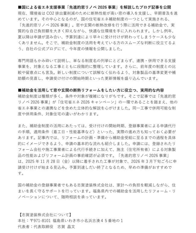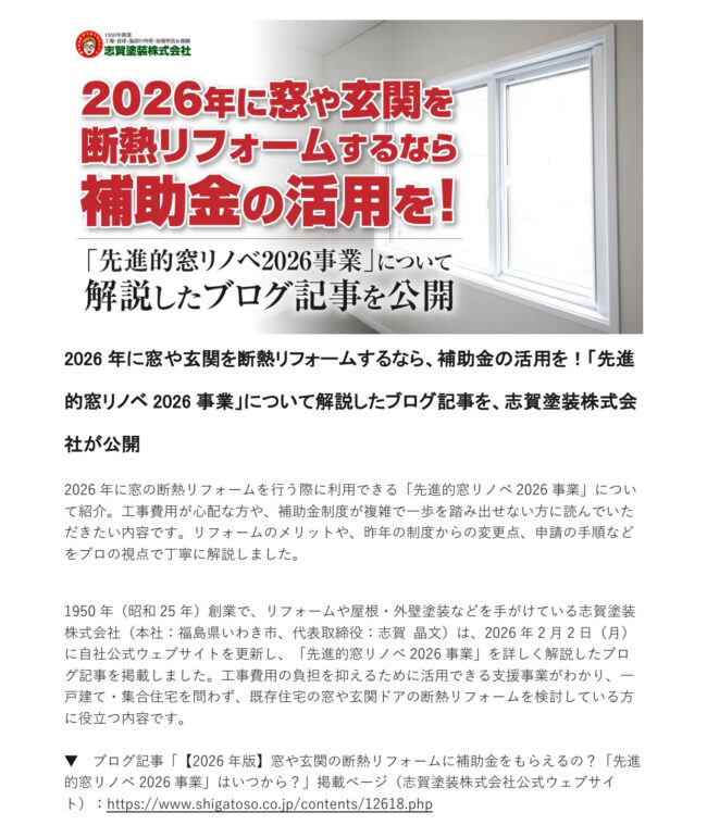 ▼ ブログ記事「【2026年版】窓や玄関の断熱リフォームに補助金をもらえるの?「先進的窓リノベ2026事業」はいつから?」掲載ページ(志賀塗装株式会社公式ウェブサイト):https://www.shigatoso.co.jp/contents/12618.php
